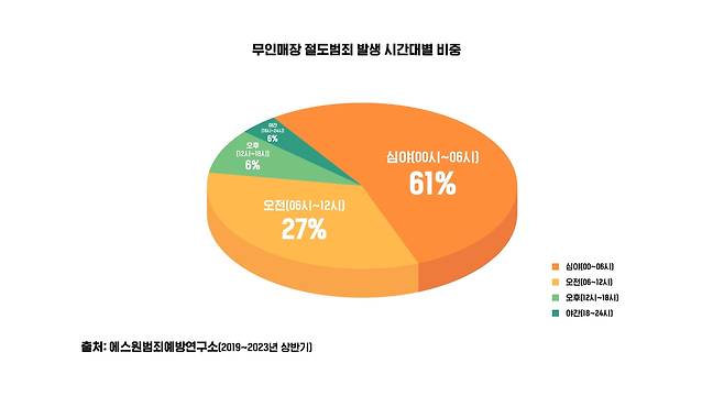 전체 절도 범죄 건수 중 토요일과 일요일이 34%를 차지, 무인매장 절도 범죄가 휴일에 집중된 것으로 나타났다. 특히 일요일 범죄율이 24%로 가장 높은 것으로 조사됐다. 시간대별로 살펴보면 심야 시간대(자정~오전 6시) 범죄율이 전체 범죄 건수의 61%로 가장 높았다.