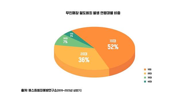 무인매장 절도 범죄의 가장 큰 특징은 미성년 절도범이 많다는 점이다. 연령대별 비중을 살펴보면 10대가 52%로 가장 높게 나타났다. 절도범 둘 중 한 명이 10대인 셈이다. 이어 2대(36%), 30대(7%), 40대(5%) 순이었다.