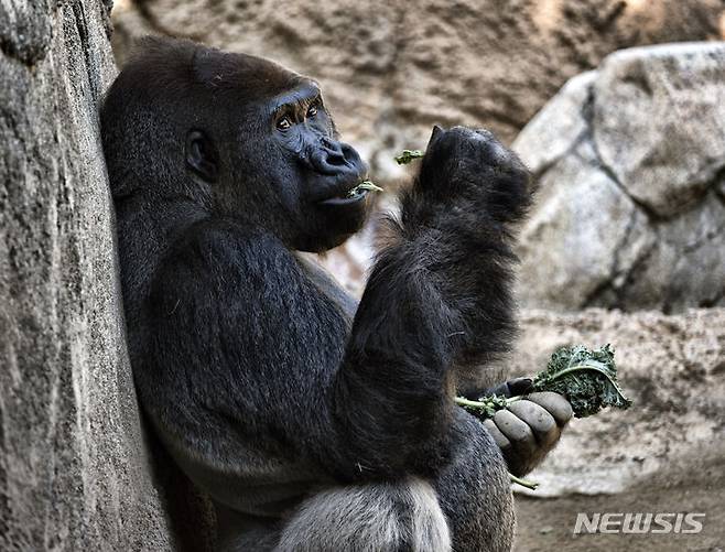 [로스앤젤레스=AP/뉴시스] 세계 고릴라의 날인 24일(현지시각) 미 캘리포니아주 로스앤젤레스 동물원에서 웨스턴로랜드 고릴라 켈리(36)가 간식을 먹으며 방문객들의 눈길을 끌고 있다. 세계 고릴라의 날은 밀렵과 서식지 파괴로 멸종 위기에 처한 고릴라 보호와 보전을 위해 2017년 고릴라 연구학자 ‘다이앤 포시’의 고릴라 연구 센터 설립을 기념하며 지정한 날이다. 2023.09.25.