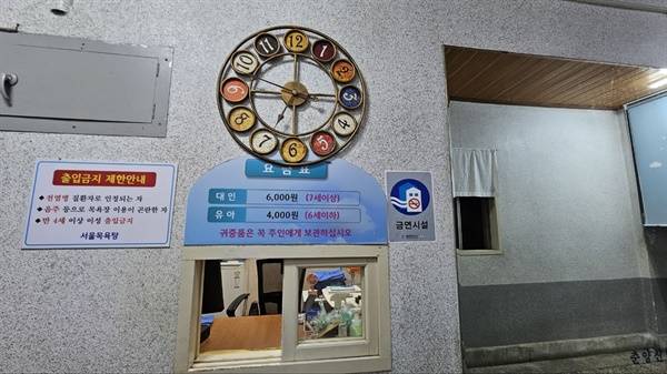 긴 통로를 따라 양 벽면에 그림들이 걸려있고, 매표소가 나온다. 40년째 같은 구조를 가진 매표소에는 오렌지색 수건과 각종 면도기, 샴푸 등 1회용품들이 있다. 언제나 밝은 미소로 손님을 맞아주는 주인장 내외분들의 인사는 덤이다.