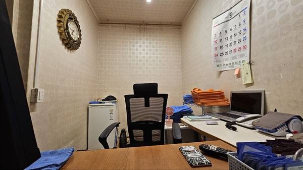 | ▲ 매표소 목욕탕에 들어가면 보이는 매표소다. 오렌지색 수건, 1회용 면도기, 샴푸 등이 있다. 40년동안 내부 구조는 변함이 없다. 이곳에서 인생이 익어가고 춘양을 오가는 사람들을 맞이했다. |