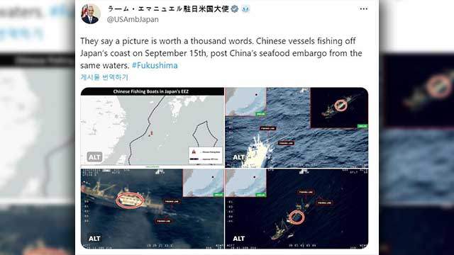이매뉴얼 대사는 이 사진에 "중국 어선들이 9월 15일 중국이 수산물 수입을 금지한 일본 연안에서 조업하고 있다"며 중국 정부의 금수 조치를 비판했습니다.