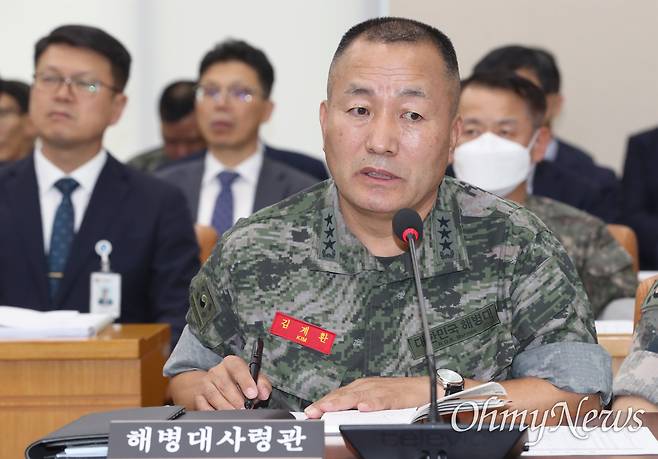 | ▲ 김계환 해병대 사령관이 25일 오후 서울 여의도 국회에서 열린 국방위원회 전체회의에서 의원 질의에 답변하고 있다. |