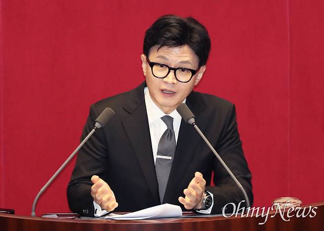 | ▲ 한동훈 법무부 장관이 21일 서울 여의도 국회에서 열린 본회의에서 이재명 대표 체포동의요청 이유 설명을 하고 있다. |