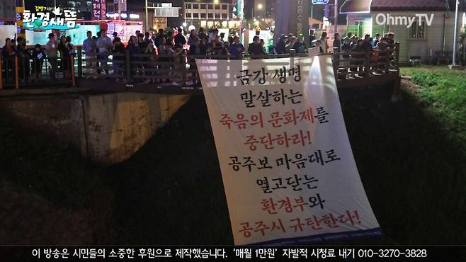 하지만 20여 일 동안 담수하면 이곳은 다시 펄밭이 되고, 죽음의 공간이 될 것입니다. 시민 여러분, 공주시에 의견을 내어 주십시오. 미래 세대에 물려줄 자랑스러운 공주시가 될 수 있도록 해주십시오."