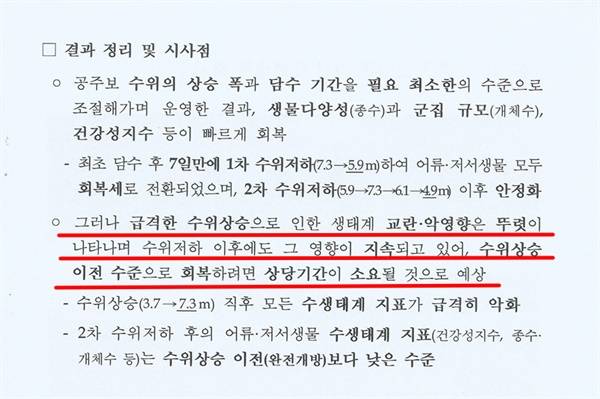 환경부는 2021년 백제문화제 사후 모니터링을 하면서 "급격한 수위 상승으로 인한 생태계 교란 악영향은 뚜렷이 나타나며 수위 저하 이후에도 그 영향이 지속되고 있어, 수위 상승 이전 수준으로 회복하려면 상당 기간이 소요될 것으로 예상되고 흰수마자, 흰목물떼새 등의 멸종위기종 서식과 모래톱 생태계에 문제가 발생했다"고 보고하기도 했다.