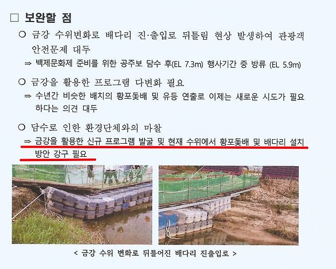 이날 금강변에 떠 있는 유등 하류 쪽에는 부교가 파손된 채 금강교 교각에 위태롭게 걸쳐 있었다. 이곳으로부터 하류 400m 지점에 있는 백제큰다리 교각에도 유등을 띄우기 위해 설치했던 황포돛배가 난파한 선박 모양으로 걸쳐 있었다. 공주보에 물을 채운 상태에서 지난 19일 내린 폭우 때문에 유실됐다. 탁상행정과 담수 강행으로 많은 예산이 낭비된 셈이다.