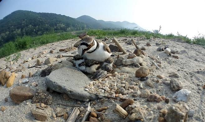 | ▲ 최근 금강에서 막 깨어난 꼬마물떼새 유조를 엄마가 품어주고 있다. |
