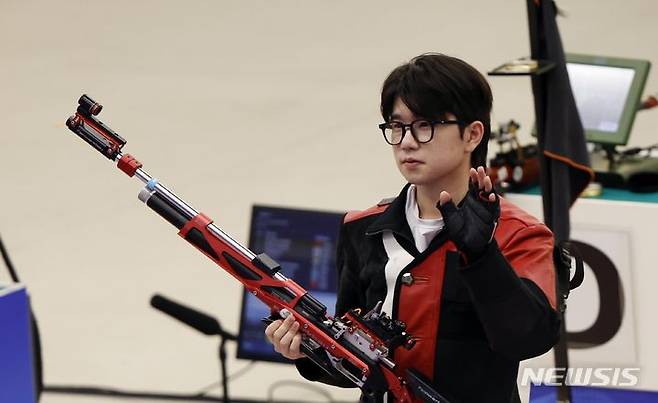 [항저우=뉴시스] 정병혁 기자 = 25일 중국 항저우 푸양 인후 스포츠센터에서 열린 2022 항저우 아시안게임 남자 10m 공기소총 개인 결선 경기에서 은메달을 확정 지은 박하준이 기뻐하고 있다. 2023.09.25. jhope@newsis.com
