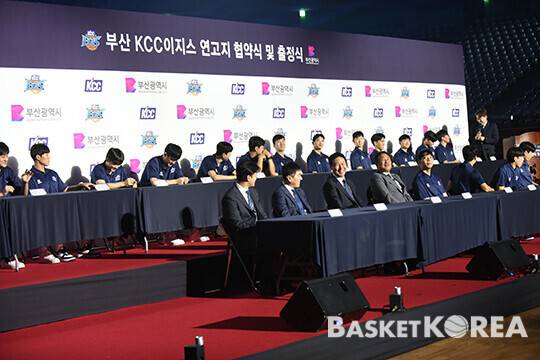 KCC 이지스는 25일 오후 2시 30분부터 부산 사직체육관에서 연고지 협약식을 겸한 출정식을 개최했다. 행사 시작 전부터 많은 팬들이 경기장을 찾아 관중석을 가득 메웠다. 700명이 넘는 팬들이 지켜보는 상황 속에 KCC 구단은 ‘부산 KCC’로서 닻을 내렸다.