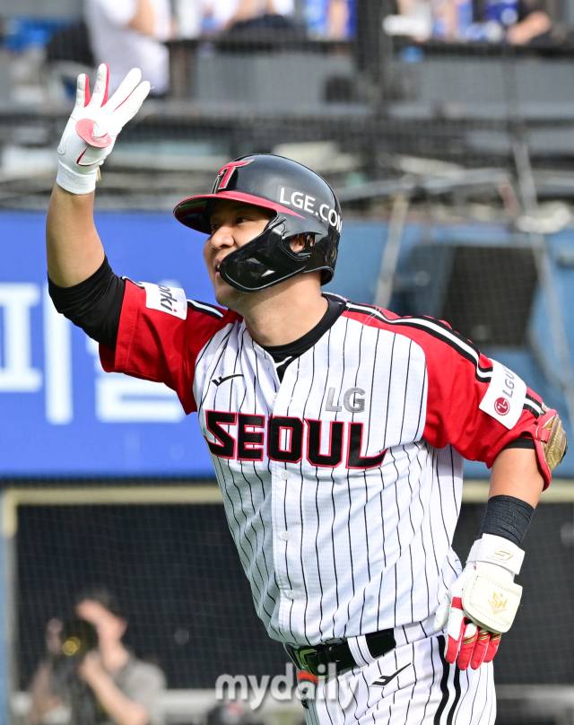 [백투백 홈런을 친 뒤 딸을 향해 세리머니를 한 김민성 / 잠실 = 유진형 기자 zolong@mydaily.co.kr]