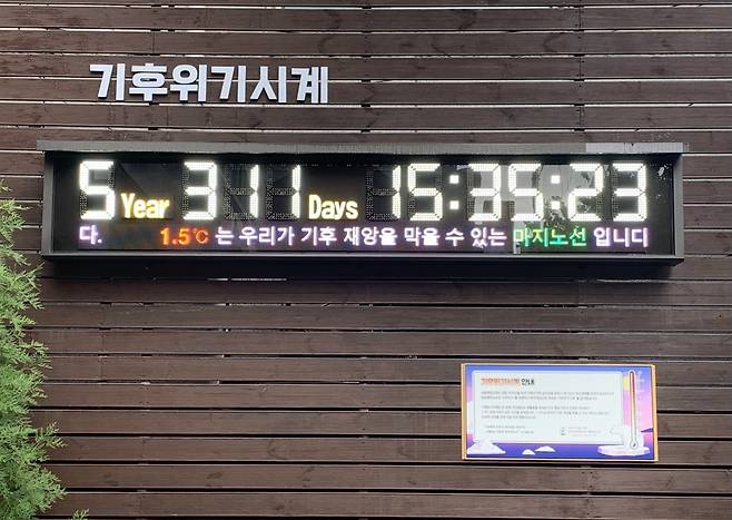 서울 중구 오장동 서울제일교회 나무 담장에 붙은 커다란 전자시계에는 이 문구가 반복해서 나온다. 일반 시계와 달리 현재 시간을 확인하는 용도로 쓰이지 않는 '기후위기시계'다. 지난 15일 마주한 기후위기시계는 지구표면 평균기온이 산업화 이전보다 1.5도 오르기까지 5년 311일이 남았음을 알리고 있었다.