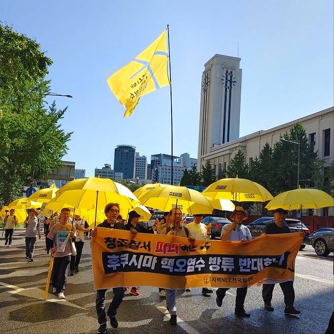 9월 7일에는 전국에서 진행한 걷기 순례회를 마무리하기 위해 150여 명이 서울역에 모였다. 일본 대사관까지 도보 순례하는 길에서도 집회 참가자들은 노란 우산을 들었다. 후쿠시마 핵 오염수 방류를 반대하는 한국 교회의 움직임에 있어 주요한 상징물로 자리 잡은 것이다.
