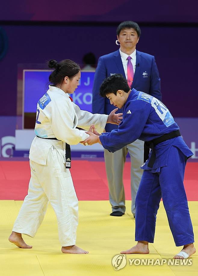 (항저우=연합뉴스) 신현우 기자 = 25일 중국 항저우 샤오산 린푸 체육관에서 열린 항저우 아시안게임 유도 여자 63kg급 동메달 결정전에서 한국 김지정이 키르기스스탄 아디나 코치콘바예바를 상대로 승리한 뒤 인사하고 있다. 2023.9.25