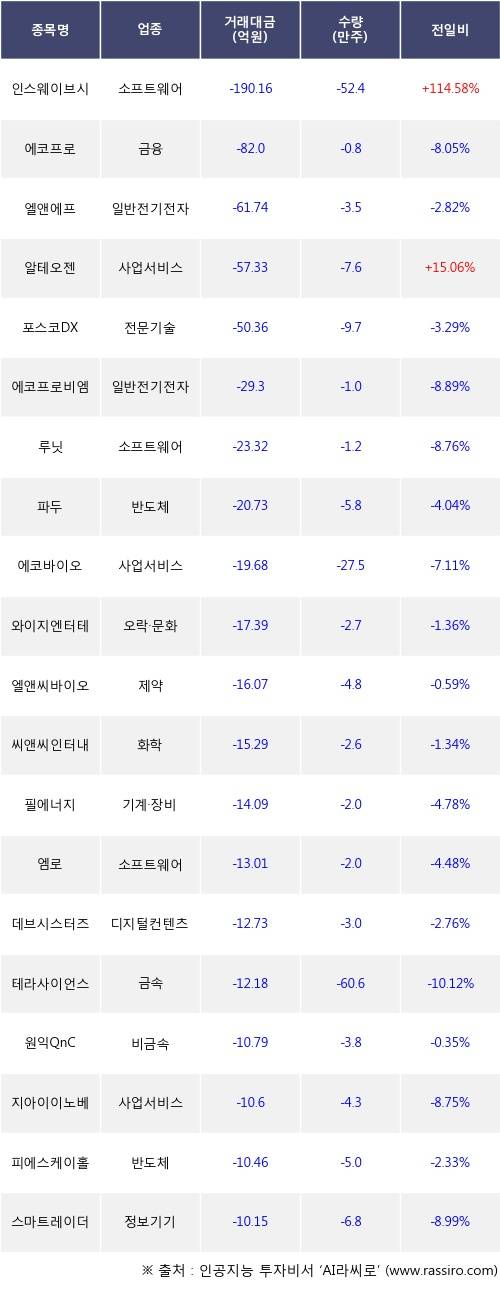 기관 투자자의 순매도 상위 20개 종목은 인스웨이브시스템즈, 에코프로, 엘앤에프, 알테오젠, 포스코DX, 에코프로비엠, 루닛, 파두, 에코바이오, 와이지엔터테인먼트등이다.