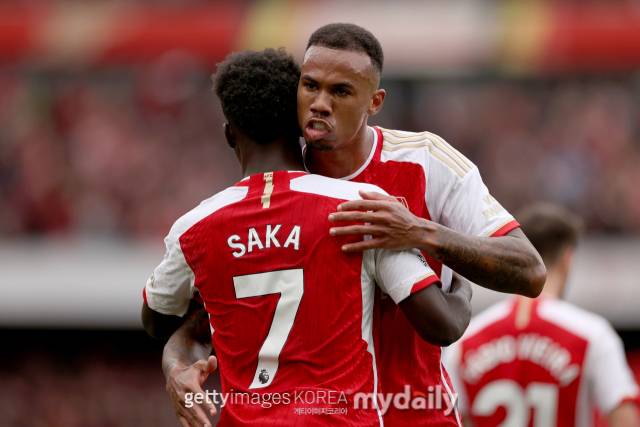 [아스날 수비수 가브리엘, 아스날전에서 멀티골을 기록한 손흥민. 사진 = 게티이미지코리아]