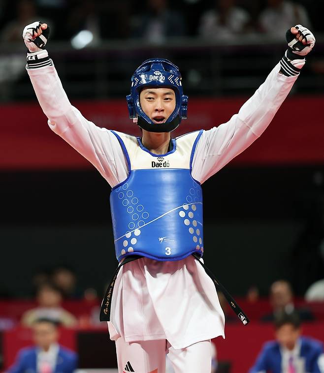 | ▲ 장준이 25일 중국 저장성 항저우의 린안 스포츠문화전시센터에서 열린 항저우 아시안게임 태권도 겨루기 남자 58㎏급 결승전에서 이란 마흐디 하지모사에이나포티에게 승리를 거둔 뒤 환호하고 있다. |