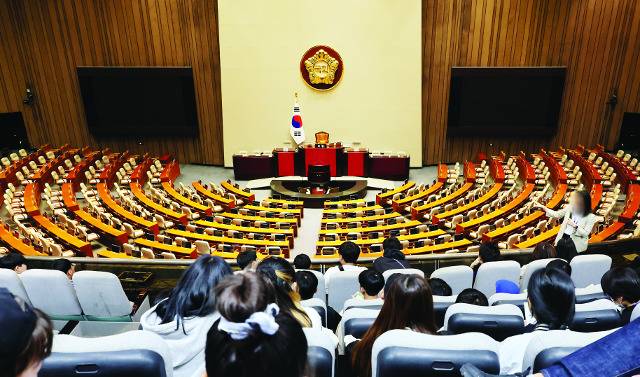 국회 본회의를 참관하러 온 학생들이 25일 텅 빈 의석을 바라보며 관계자의 설명을 듣고 있다. 이날 예정됐던 이균용 대법원장 후보자의 임명동의안 표결을 위한 본회의는 더불어민주당 원내 지도부의 사퇴로 인해 무산됐다.