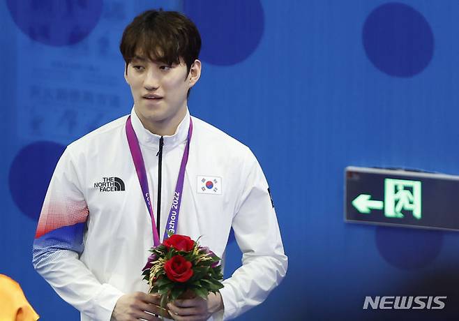 [항저우=뉴시스] 정병혁 기자 = 최동열이 25일 중국 항저우 올림픽 스포츠센터 수영장에서 열린 2022 항저우 아시안게임 남자 평영 100m 시상식을 마친 뒤 동메달을 목에 걸고 이동하고 있다. 2023.09.25. jhope@newsis.com