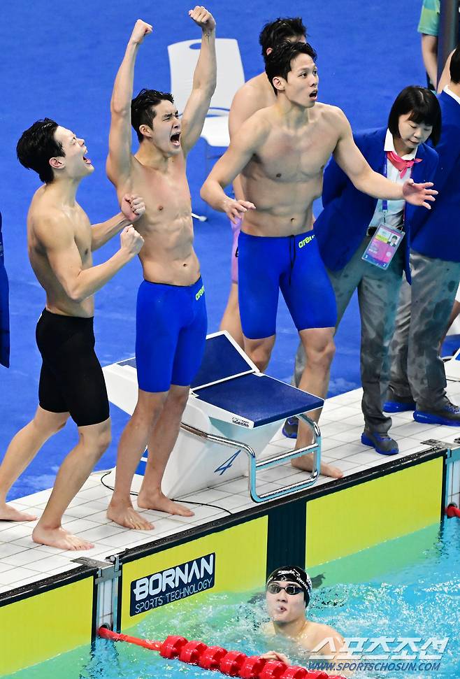 25일 중국 항저우 올림픽스포츠센터 수영장에서 열린 '항저우아시안게임' 남자 계영 800m 자유형 결승에서 대한민국이 아시아신기록을 세우며 금메달을 차지했다. 기록 확인하며 환호하는 선수들. 항저우(중국)=송정헌 기자songs@sportschosun.com/2023.09.25/