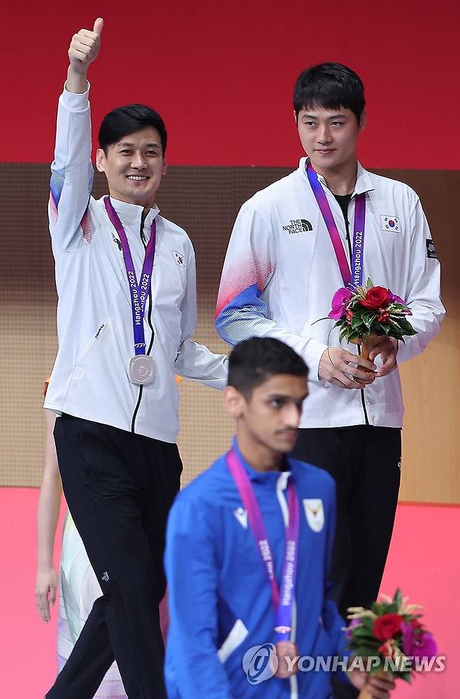 (항저우=연합뉴스) 류영석 기자 = 25일 중국 항저우 전자대학 체육관에서 열린 2022 항저우 아시안게임 펜싱 남자 사브르 개인전 메달 수여식에서 금메달을 획득한 오상욱과 은메달을 획득한 구본길이 밝은 표정으로 퇴장하고 있다. 2023.9.25