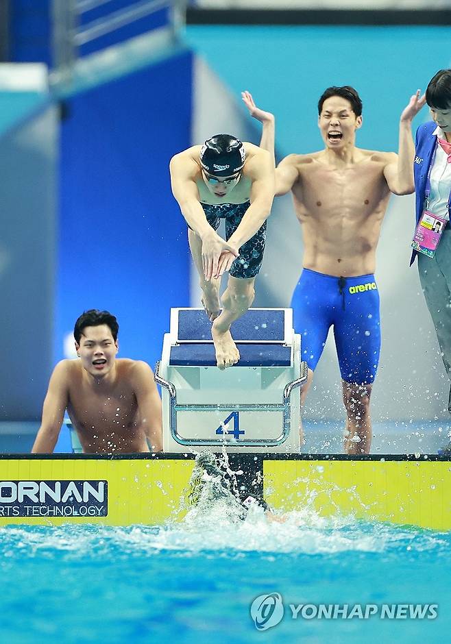 (항저우=연합뉴스) 홍해인 기자 = 황선우가 25일 중국 항저우 올림픽 스포츠센터 수영장에서 열린 2022 항저우 아시안게임 수영 남자 계영 800m 자유형 결승에서 마지막 영자로 나서 역영하고 있다. 2023.9.25