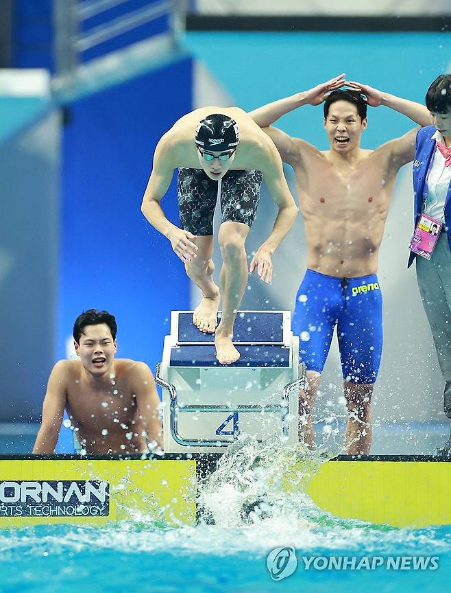 (항저우=연합뉴스) 홍해인 기자 = 황선우가 25일 중국 항저우 올림픽 스포츠센터 수영장에서 열린 2022 항저우 아시안게임 수영 남자 계영 800m 자유형 결승에서 마지막 영자로 나서 역영하고 있다. 2023.9.25