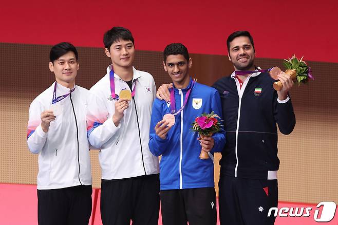 (항저우(중국)=뉴스1) 신웅수 기자 = 25일 오후 중국 항저우 디안즈대학 체육관에서 열린 2022 항저우 아시안게임 펜싱 남자 사브르 개인전 메달 수여식에서 금메달을 차지한 오상욱과 은메달을 차지한 구본길이 메달을 들고 포즈를 취하고 있다. 2023.9.25/뉴스1