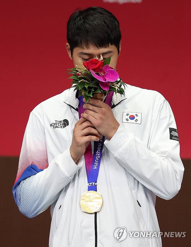 (항저우=연합뉴스) 이지은 기자 = 2022 항저우 아시안게임 펜싱 남자 사브르 개인전에서 금메달을 차지한 오상욱이 25일 중국 항저우 전자대학 체육관에서 열린 메달 시상식에서 금메달을 목에 건 뒤 꽃냄새를 맡고 있다. 2023.9.25