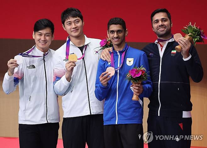 (항저우=연합뉴스) 류영석 기자 = 25일 중국 항저우 전자대학 체육관에서 열린 2022 항저우 아시안게임 펜싱 남자 사브르 개인전 메달 수여식에서 금메달을 획득한 오상욱과 은메달을 획득한 구본길이 메달을 보여주고 있다. 2023.9.25