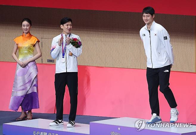 (항저우=연합뉴스) 류영석 기자 = 25일 중국 항저우 전자대학 체육관에서 열린 2022 항저우 아시안게임 펜싱 남자 사브르 개인전 메달 수여식에서 은메달을 획득한 구본길이 금메달을 획득한 후배 오상욱을 축하해주고 있다. 2023.9.25