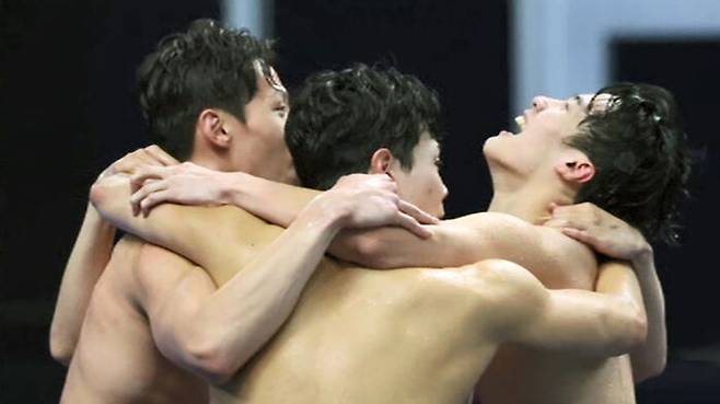 한국 신기록을 넘어 아시아 신기록을 경신한 선수들은 얼싸안고 환호하며, 한국 수영 사상 첫 단체전 금메달의 기쁨을 만끽했습니다.