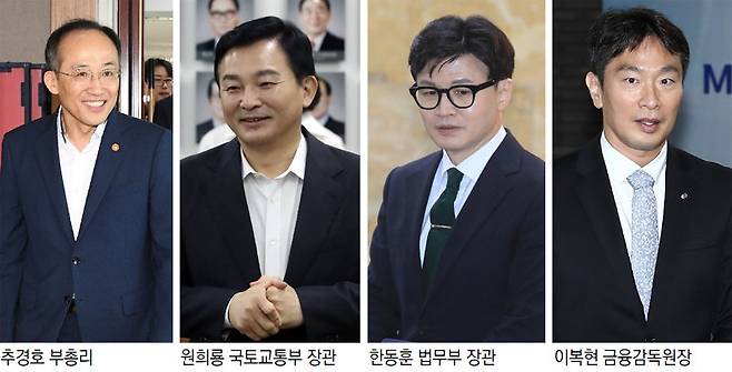 추 부총리는 연금·노동 개혁과 수출, 규제 완화 정책의 컨트롤타워다. 원 장관은 부동산 공급 대책과 한국토지주택공사(LH) 혁신 등 대형 해결 과제를 떠안고 있다. 이 원장은 가계부채 및 금융사고 대응의 최전선에 있다. 해수부는 일본 후쿠시마 오염수 방류에 대응해야 하는 주무 부처다. 공직사회의 모든 관심이 각 부처 장차관이나 용산 참모들의 출마 여부로 쏠리면서 정부의 국정동력이 상실되는 문제가 발생할 가능성이 작지 않다. 출마설이 도는 부처의 실무 공무원들이 인기 없는 정책 추진을 뒤로 미루려는 유혹에 빠질 것이란 우려도 나온다.