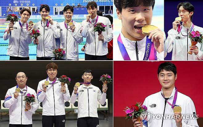 25일 대표팀은 수영 남자 계영 800m에 출전한 김우민(왼쪽 상단 사진 왼쪽부터), 황선우, 이호준, 양재훈이 7분 01초 73의 아시아 신기록으로 금메달을 획득했다.
