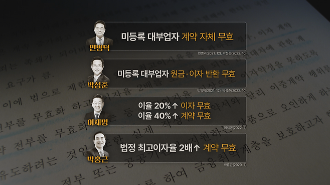 ‘미등록 대부업자’라는 ‘불법사금융업자’로 고쳐서 미등록은 불법이라는 사실을 확실하게 하는 방안. 그리고 불법 사금융업자들이 받을 수 있는 최고 이자율을 6%로 낮추자는 방안. 이런 방안을 담은 정부의 대부업법 개정안이 지난 2020년 국회로 넘어가 있다. 하지만 해당 법안은 4년째 국회에서 계류 중이다. 형법으로 사채업자를 벌 줄 수 있는 데, 민법상 규제를 더 하는 것은 과하다는 주장, 그리고 사인 간의 거래를 법으로 규제하는 것이 합당한가 하는 문제가 제기됐기 때문이다.