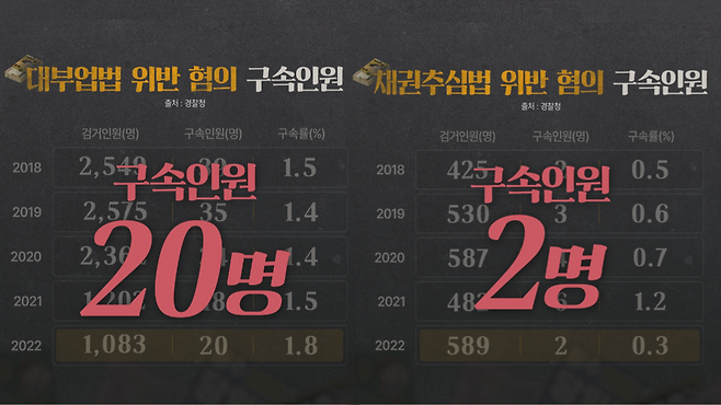 우리나라의 사채업자들은 경찰에 잘 안 잡힌다. 지난해 대부업법 위반 혐의로 경찰에 검거된 사람은 모두 천여 명. 이 가운데 구속된 사람은 단 20명에 불과하다. 불법채권추심법 위반 혐의로 검거된 사람은 580여 명인데 구속된 사람은 2명이다.