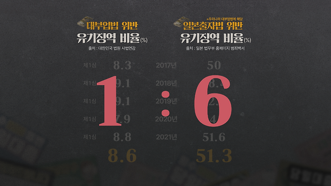 이들은 사법부에 가서도 솜방망이 처벌을 받는다. 지난 5년 동안 우리나라에서 대부업법 위반으로 유기징역을 받은 비율은 전체의 8%. 같은 기간, 일본에서 유기징역 결정을 내린 비율은 전체의 절반 가량이었다. 사채업자가 받는 유기징역 비율이 일본의 6분의 1에 불과하다.