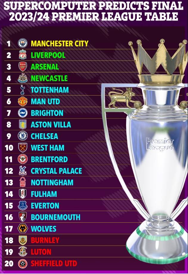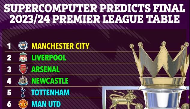 맨시티, 리버풀, 아스널, 뉴캐슬이 프리미어리그 'Top 4'를 차지할 것으로 계산한 슈퍼컴퓨터는 토트넘과 맨유가 각각 5위와 6위를 차지해 상위 4위 이내에 들지 못할 것으로 추측해 눈길을 끌었다.