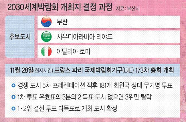 26일 부산시에 따르면 세계 3대 메가 이벤트 중 하나인 월드엑스포는 올림픽·월드컵보다 개최 기간이 6개월로 훨씬 길고, 각종 경제 효과(총 61조 원)도 탁월해 유치에 성공할 경우 부산 등 동남권 발전을 획기적으로 이룰 수 있을 것으로 기대하고 있다. 현재 남은 공식 일정은 국제박람회기구(BIE) 본부 소재지이자 각국 BIE 대표들이 상주하는 프랑스 파리에서 개최하는 10월 심포지엄과 11월 28일(현지시간) 경쟁국 5차 프레젠테이션(PT) 및 개최 도시 결정투표만을 남겨두고 있다.