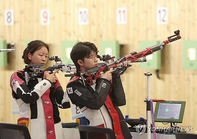 (항저우=연합뉴스) 류영석 기자 = 26일 중국 항저우 푸양 인후 스포츠센터에서 열린 2022 항저우 아시안게임 사격 혼성 공기소총 10m 예선에서 이은서와 박하준이 사격을 준비하고 있다. 2023.9.26