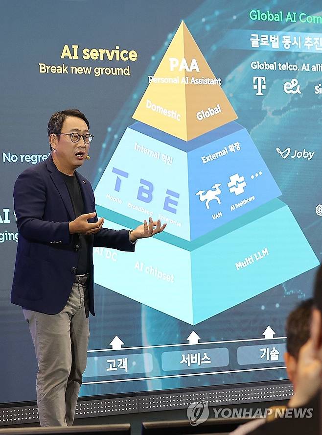 (서울=연합뉴스) 이재희 기자 = 유영상 SK텔레콤 사장이 26일 오전 서울 중구 SKT타워에서 열린 기자간담회에서 AI 사업전략을 발표하고 있다. 2023.9.26