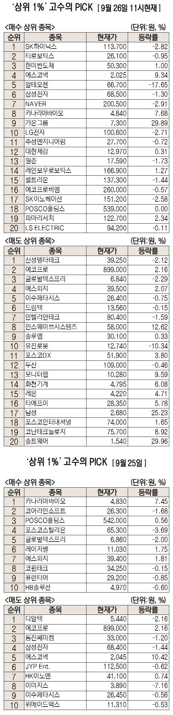 미래에셋증권은 자사 고객 중에서 지난 1개월간 수익률 상위 1% 투자자들의 매매 종목을 집계해 실시간·전일·최근 5일 기준으로 모바일트레이딩시스템(MTS)상에서 공개하고 있다. 이 통계 데이터는 미래에셋증권의 의견과 무관한 단순 정보 안내이며, 각각의 투자자 개인에게 맞는 투자 또는 수익 달성을 보장하지 않는다. 또 테마주 관련종목은 이상급등락 가능성이 있으므로 유의해야 한다.