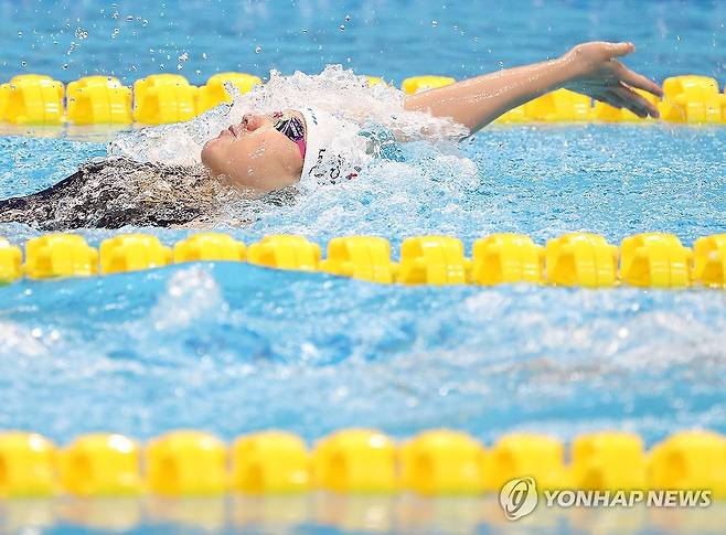 (항저우=연합뉴스) 이지은 기자 = 26일 중국 항저우 올림픽 스포츠센터 수영장에서 열린 2022 항저우 아시안게임 수영 여자 배영 200m 예선에서 이은지가 역영하고 있다. 2023.9.26