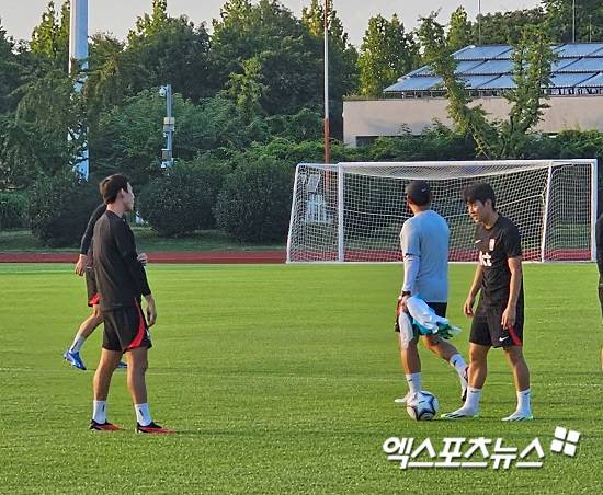 이날 훈련장에 들어서자마자 눈에 띄었던 건 이강인과 송민규의 '꿀케미'였다. 두 선수는 대표팀에서 이미 여러차례 좋은 호흡을 보여줬다. 이번 대회에서는 태국전 종료 후 이강인이 관중석에서 그라운드로 내려오자 송민규가 이강인을 격하게 끌어안고 머리를 잡고 흔드는 등 반가움을 드러내는 장면이 포착됐다.