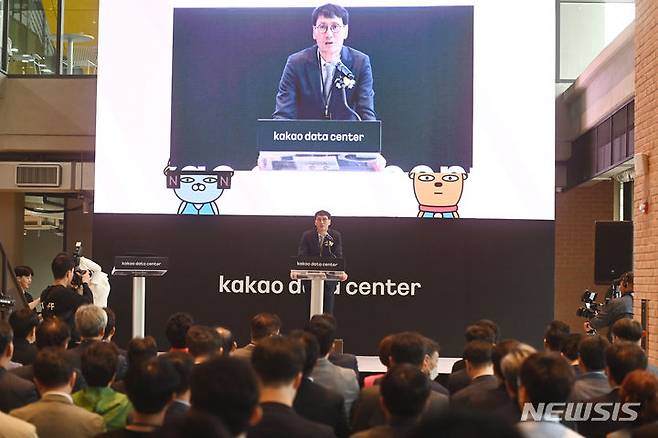 [안산=뉴시스] 김종택기자 = 카카오 데이터센터 준공식이 열린 26일 경기도 안산시 한양대학교 에리카 캠퍼스에서 홍은택 대표가 환영사를 하고 있다. 내년 1분기 가동 예정인 데이터센터는 10만대 이상의 서버를 운영할 수 있는 초대형급인 하이퍼스케일을 자랑하며 총 12만대의 서버를 보관할 수 있고 저장 가능한 테이터량은 6EB(엑사바이트)에 달한다. 2023.09.26. jtk@newsis.com