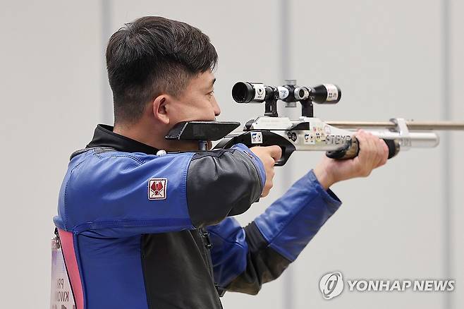 (항저우=연합뉴스) 신현우 기자 = 26일 중국 항저우 푸양 인후 스포츠센터에서 열린 항저우 아시안게임 남자 10m 러닝타깃 혼합 경기에서 북한 권광일이 조준하고 있다. 2023.9.26