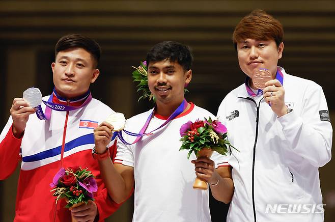 [항저우=뉴시스] 정병혁 기자 = 26일 중국 항저우 푸양 인후 스포츠센터에서 열린 2022 항저우 아시안게임 남자 10m 러닝타깃 혼합 개인 시상식에서 은메달을 차지한 북한 권광일, 금메달을 차지한 인도네시아 푸트라 무하마드 세자테라 드위, 동메달을 차지한 정유진이 기념촬영을 하고 있다. 2023.09.26. jhope@newsis.com