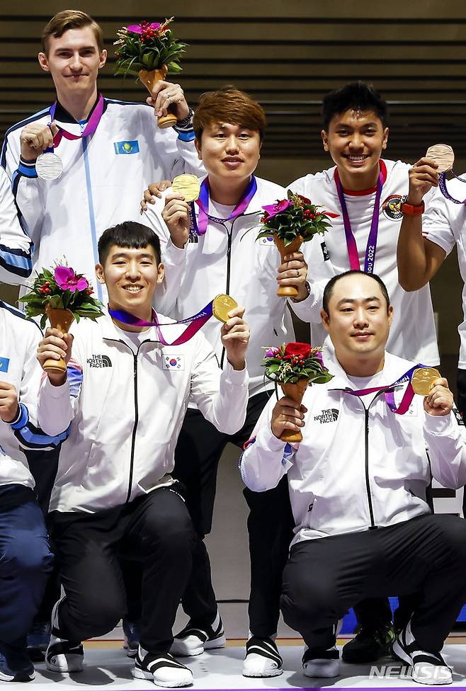 [항저우=뉴시스] 정병혁 기자 = 26일 중국 항저우 푸양 인후 스포츠센터에서 열린 2022 항저우 아시안게임 남자 10m 러닝타깃 혼합 시상식에서 금메달을 차지한 하광철, 곽용빈, 정유진이 메달을 목에 걸고 기념촬영을 하고 있다. 2023.09.26. jhope@newsis.com