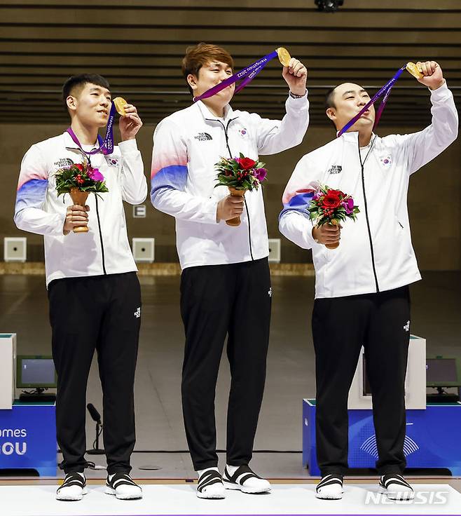 [항저우=뉴시스] 정병혁 기자 = 26일 중국 항저우 푸양 인후 스포츠센터에서 열린 2022 항저우 아시안게임 남자 10m 러닝타깃 혼합 시상식에서 금메달을 차지한 하광철, 곽용빈, 정유진이 메달을 목에 걸고 기뻐하고 있다. 2023.09.26. jhope@newsis.com
