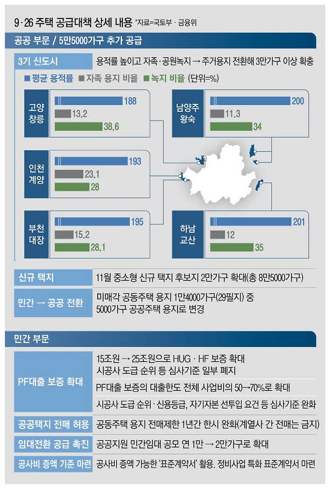 이번 9·26 주택공급 대책의 핵심은 공공 물량을 최대한 확보해 총력전에 나서는 것이다. 이를 위해 수도권 3기 신도시(3만가구), 신규 택지(8만5000가구), 민간 물량 공공 전환(5000가구)을 통해 12만가구 이상 공급을 늘린다는 방침이다. 지구계획과 주택사업계획을 동시에 승인하는 패스트트랙도 적용해 속도감을 높인다.